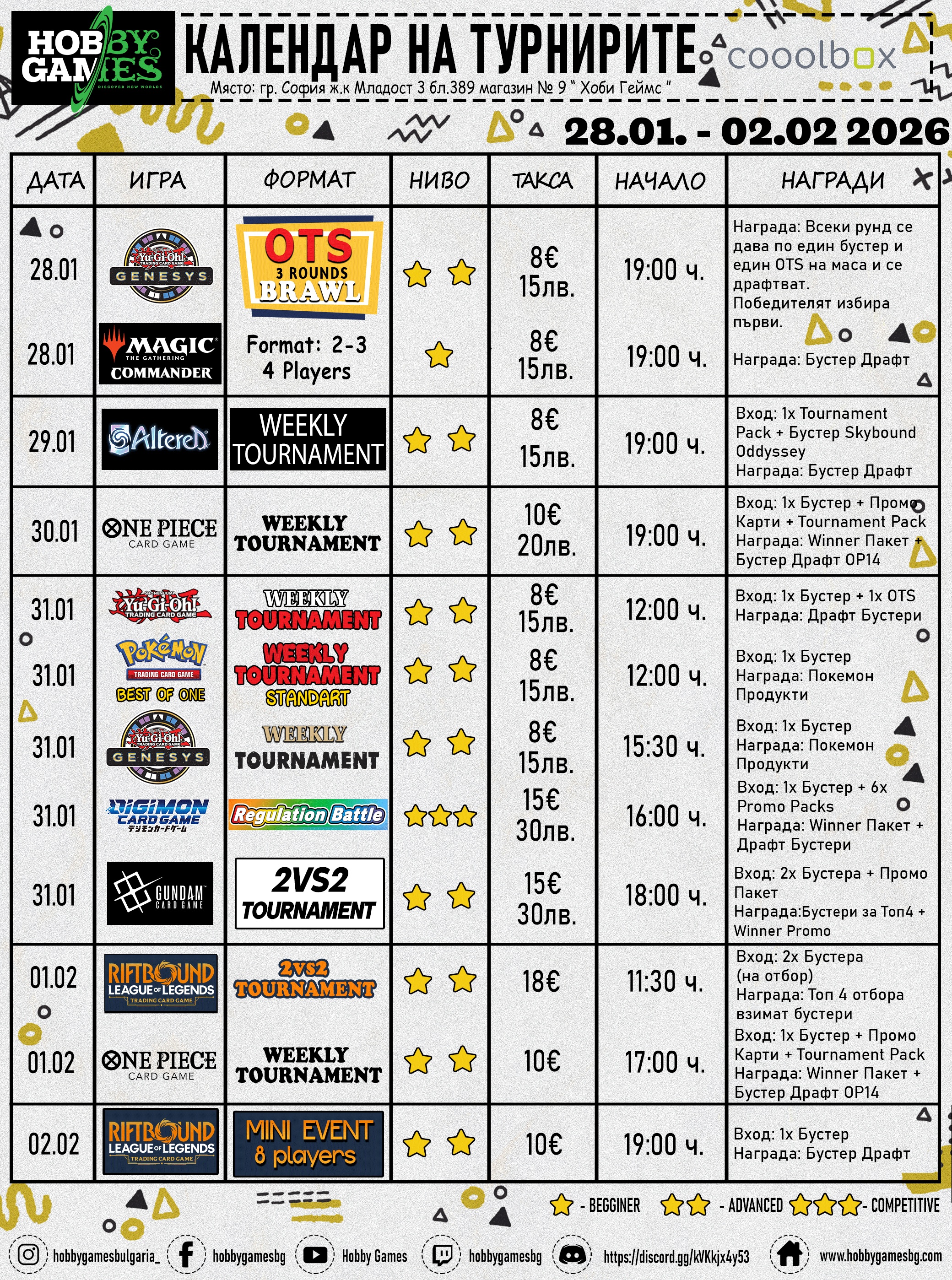 Hobby Games’s Tournaments are held in Hobby Games’s store/club located in Sofia, Bulgaria.