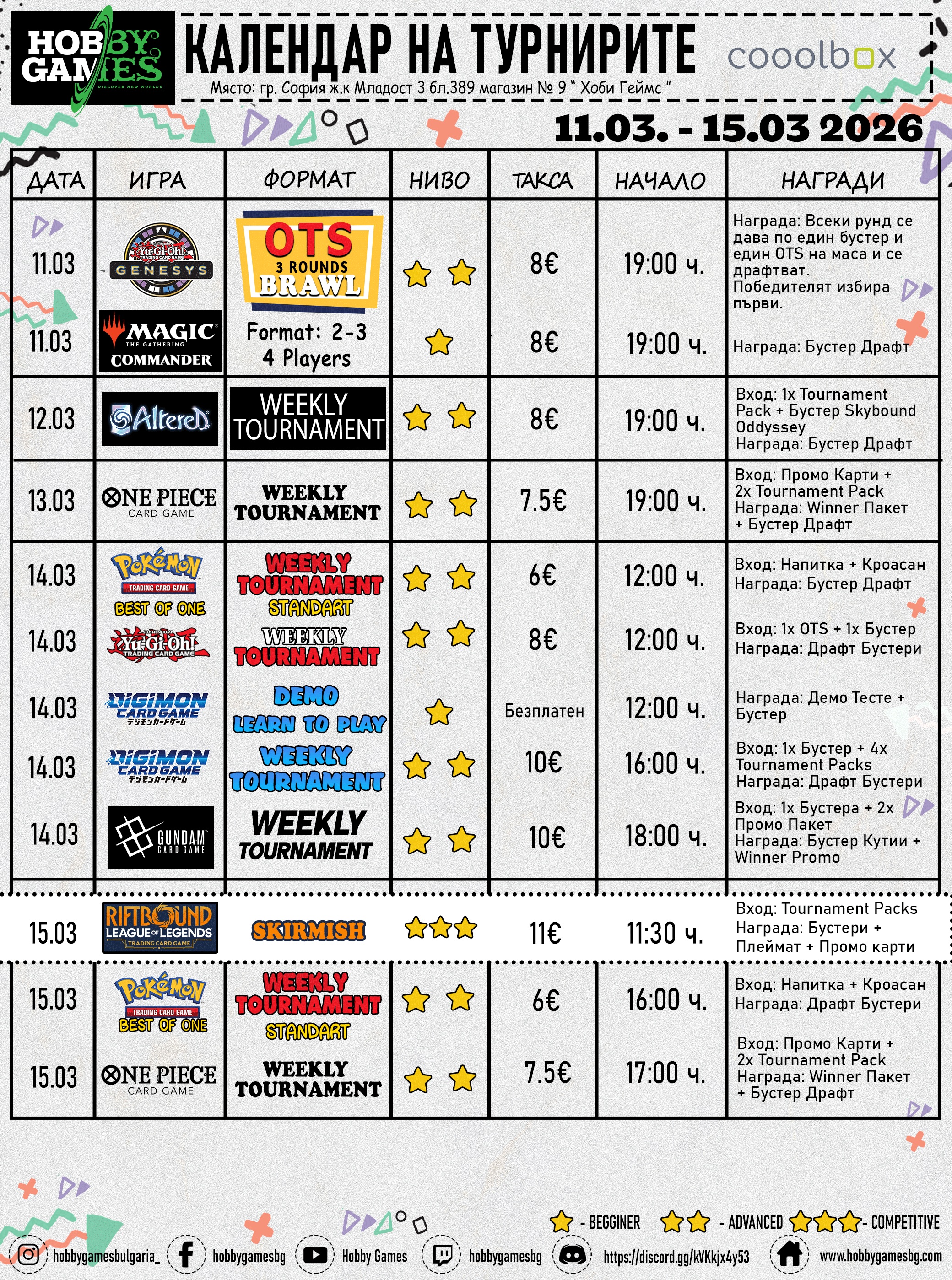 Hobby Games’s Tournaments are held in Hobby Games’s store/club located in Sofia, Bulgaria.