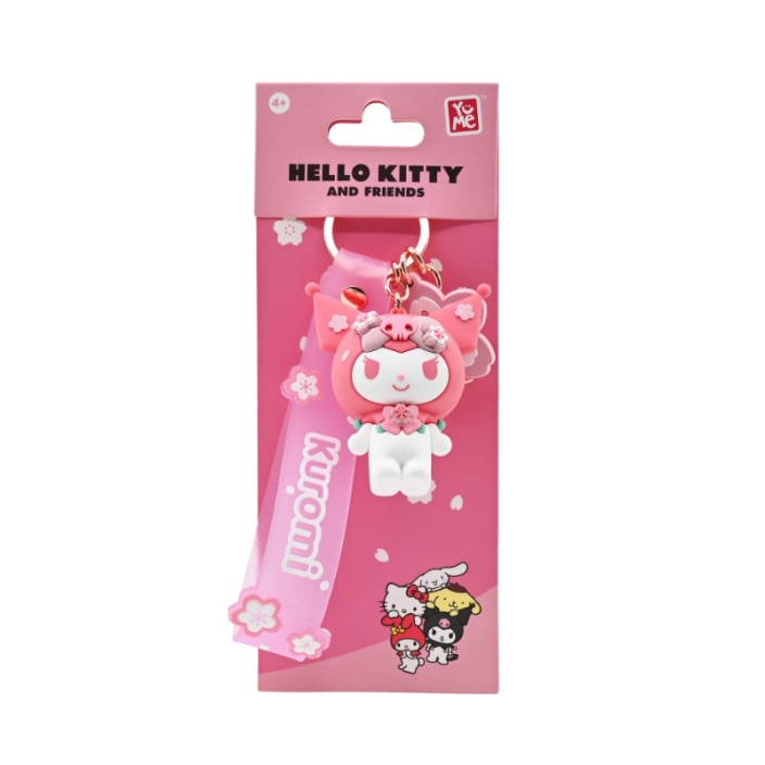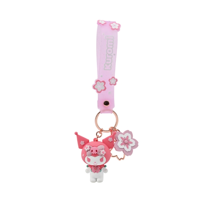- The Sanrio Sakura Series Keychain with Hand Strap featuring Kuromi is crafted from high-quality, durable PVC (Polyvinyl Chloride) material. The hand strap is made from soft, flexible silicone, ensuring comfort and strength for daily use, while the key ring is made from sturdy metal to securely hold your keys.