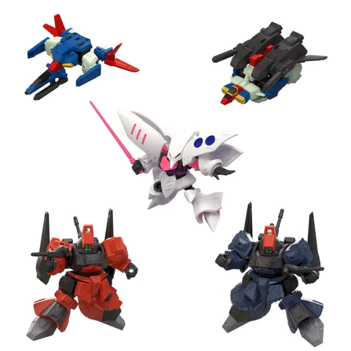 The tenth "Mobility Joint Gundam" lineup from Bandai includes four Mobile Suits from "Mobile Suit Gundam ZZ" -- the ZZ Gundam, Qubeley, Rick Dias (Quattro Bajeena's machine), and Rick Dias. The ZZ Gundam adopts a combination structure; combine the Core Top and Core Base to complete a larger-volume ZZ Gundam! The weapons can also be strengthened to various forms by using the EX parts. Each item comes with a piece of soda-flavored gum; there are eight different items to collect and trade, randomly packed in boxes of ten. Order yours today!