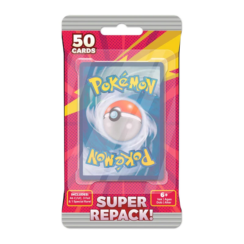 Pokemon TCG - Super Repack 50 is a fun and exciting card bundle for Pokémon fans, collectors, and players looking to grow their collection with original Pokémon TCG cards. Each pack includes 50 assorted Pokémon TCG cards from various releases, making it a great choice for discovering a wide mix of cards in one product. Inside, you will also find 3 foil Pokémon cards and 1 Ultra Rare Pokémon card for extra value and surprise. The Special Rare card in this package may be a variation of popular card types such as V, VMAX, VSTAR, Radiant, Full Art Trainer, ex, or Mega ex. Perfect for gifting, collecting, trading, and casual deck building, this repack offers a thrilling Pokémon TCG opening experience for fans of all ages.