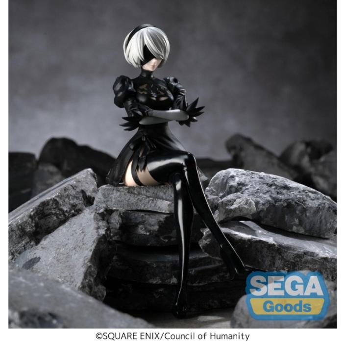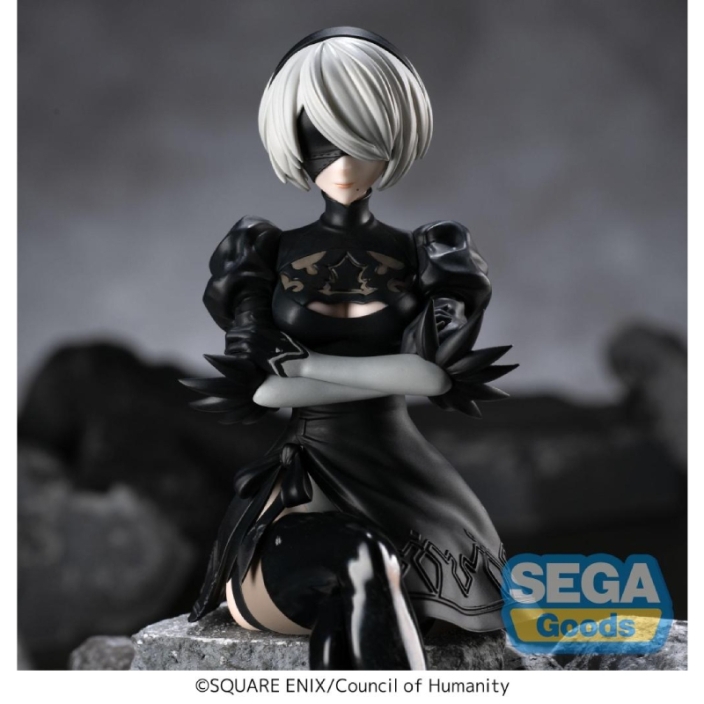 Фигурката представя 2B в седнала поза, облечена в черната си бойна униформа, с изящно изработени детайли по роклята, ботушите и бялата лента за очи. Нежното оцветяване и плавната скулптура подчертават нейния спокоен, но загадъчен характер.