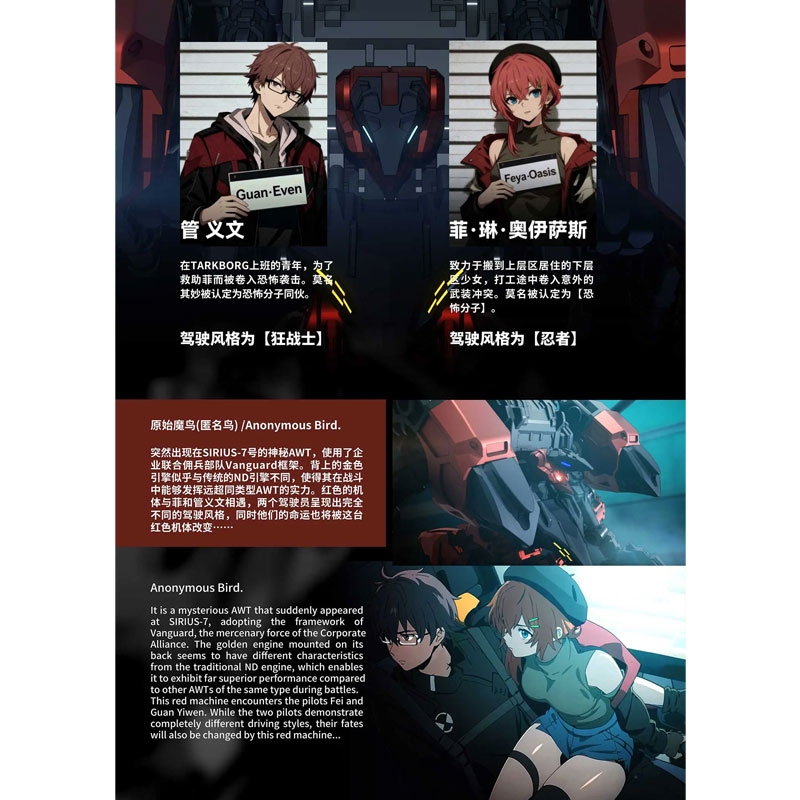 BigFirebird Build ни представя нов модел в мащаб 1/60 на Anonymous Bird от научнофантастичната манга "BIRD/BINARY Shade"! Този модел е пълен с трикове, които му позволяват да се трансформира в четири различни форми! Гръдният модул се разгъва, за да разкрие пилотска кабина, а вътре може да се постави фигурка на пилот; включени са и уникалните му оръжия. Поръчайте го за вашата собствена колекция още днес!